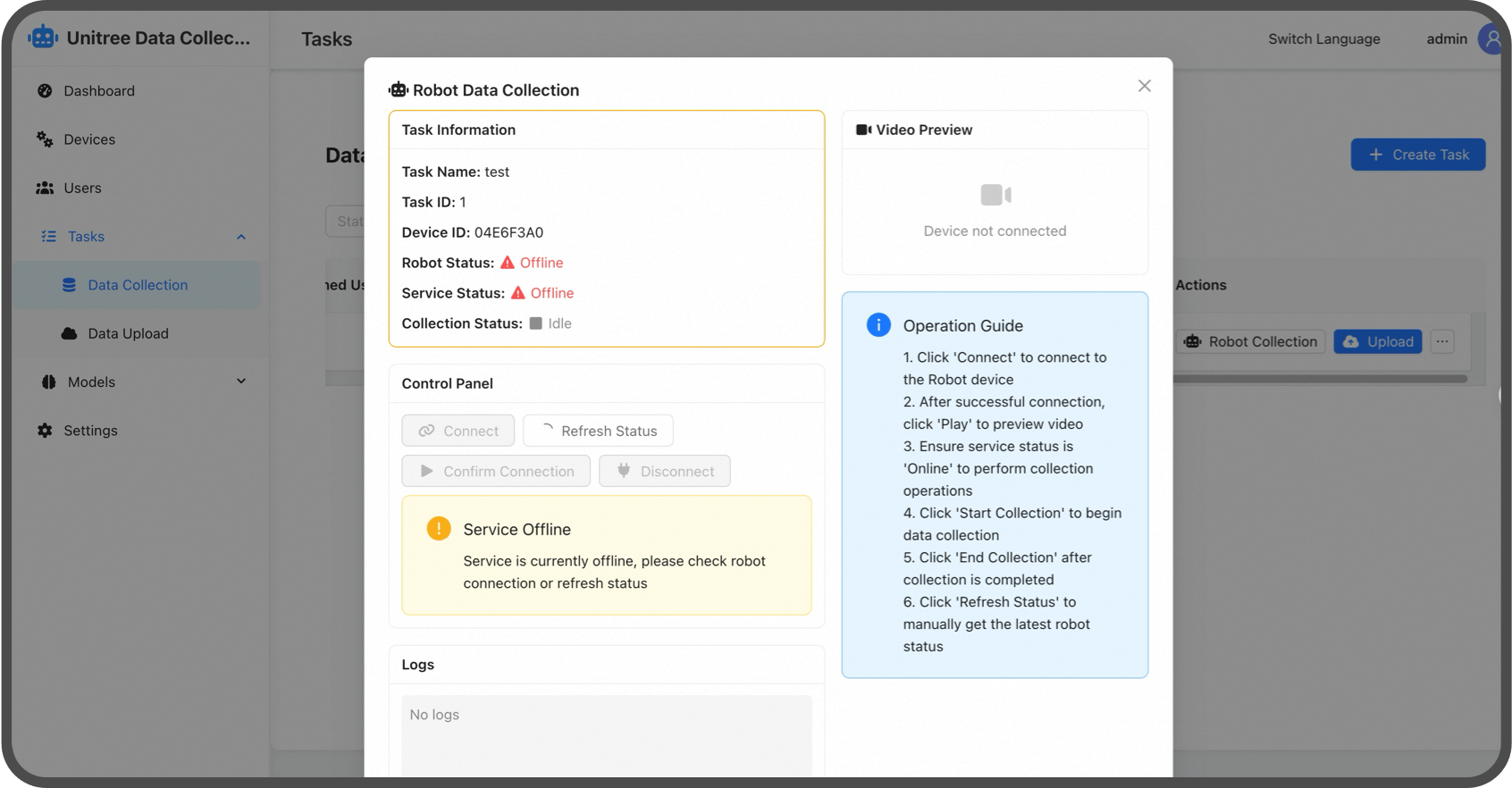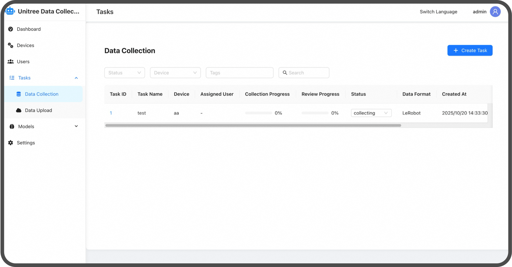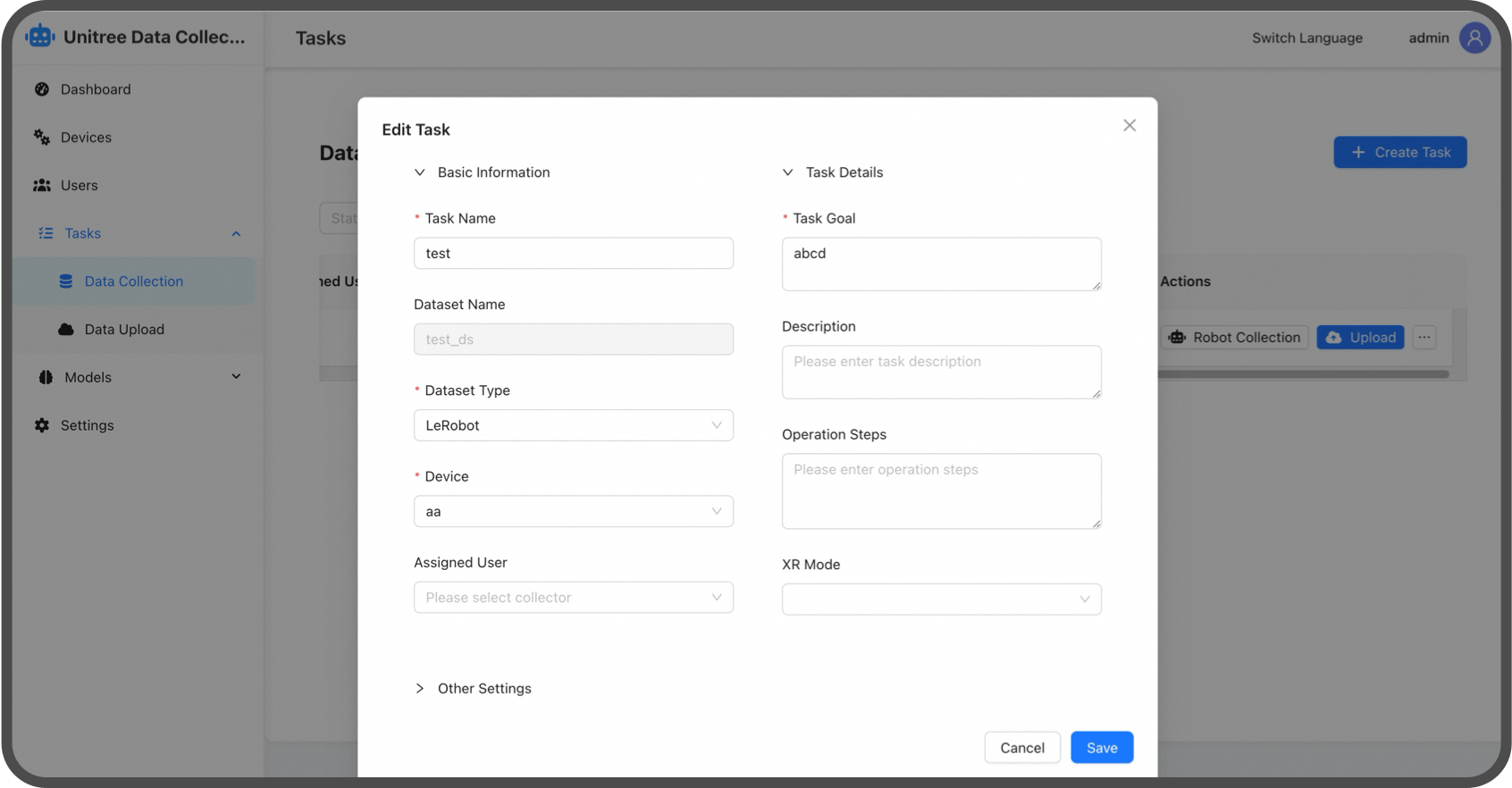 Unitree G1-D to integracja zarządzania projektami, przydzielania zadań, śledzenia postępów i analizy statusu w ramach jednej platformy. Dzięki konfiguracjom opartym na szablonach, zadania gromadzenia danych można generować jednym kliknięciem. Śledzenie całego procesu pracy w czasie rzeczywistym zapewnia płynniejszą współpracę i bardziej wydajne gromadzenie danych.