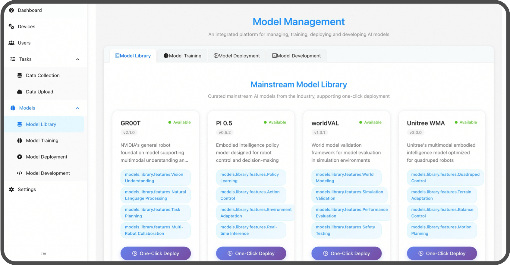 Unitree G1-D obsługuje kompleksowy workflow, od przetwarzania danych po wdrażanie modeli jednym kliknięciem. Platforma płynnie integruje różne popularne frameworki typu open source dla robotów.