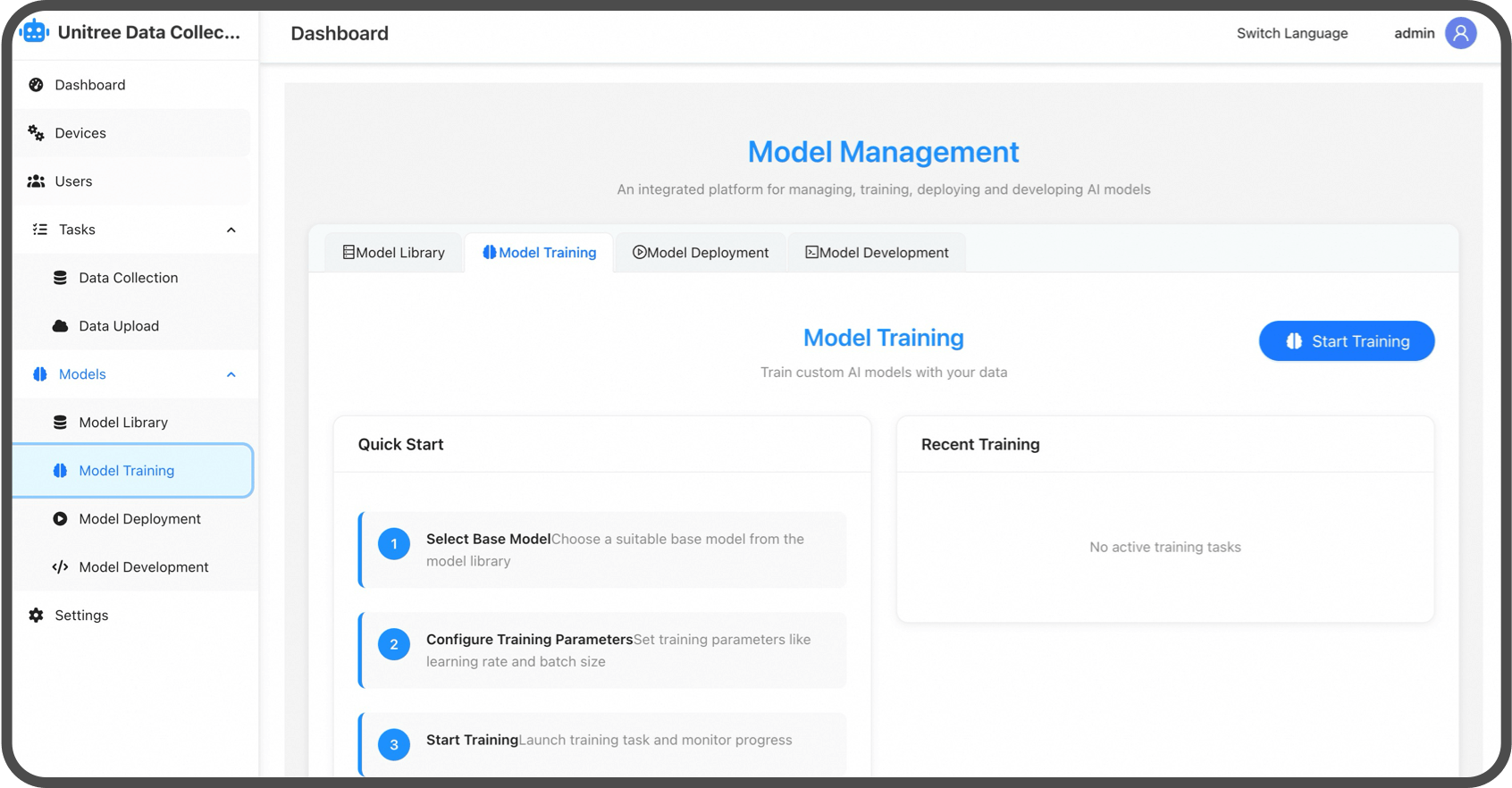Unitree G1-D to ujednolicona platforma dla całego procesu przetwarzania danych: pozyskiwania, przetwarzania, oznaczania, przeglądu i zarządzania zasobami danych.